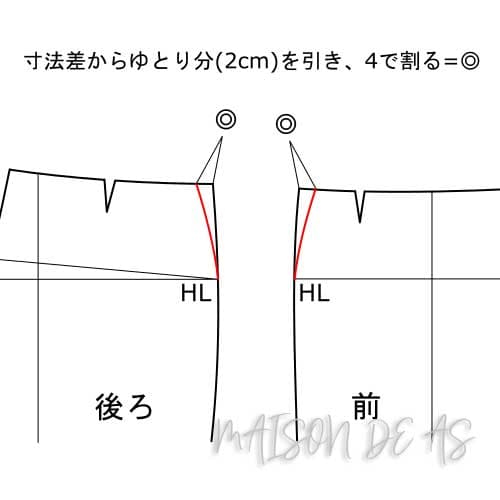 2.3 ■(2.2で測った余分)からゆとり分(2cm)を引き、4で割った寸法(◎)を前後パンツ脇からそれぞれ引き、HLまでなだらかに繋げます。