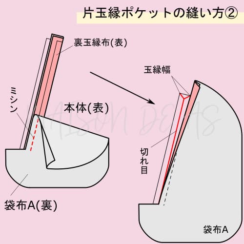 2. 玉縁布と袋布Aを本体につける