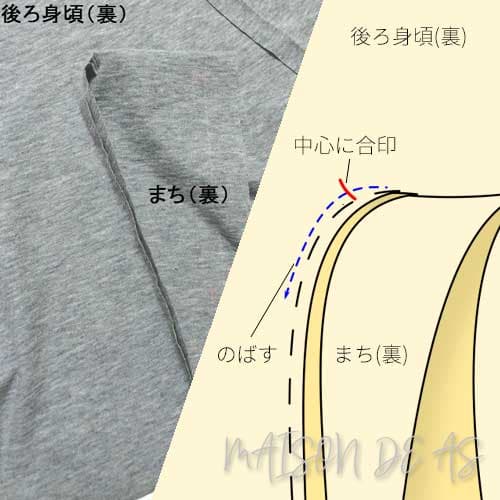 2.1.1 【ベビー2wayオール】上記の1.1でつけた合印を合わせてまち針で止めます。後ろ身頃の股ぐり部分の縫い代に適宜切り込みを入れながらのばし、マチの印線と合わせていきます。