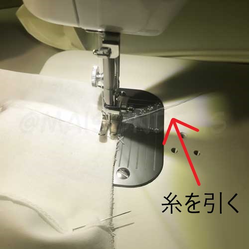 - 糸を引いたまま2~3針縫い進み、あとは普段通り返し縫いをして縫い始めます。