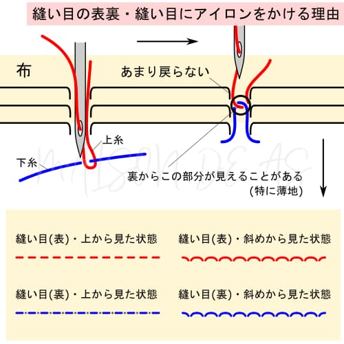 針を貫通させて上糸の間に下糸を通すというミシン縫いの性質上、縫い目には表と裏が存在します。