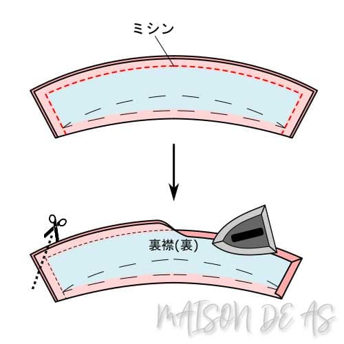 1.4 アイロンで出来上がり線に沿って縫い代を裏襟側に折ります。